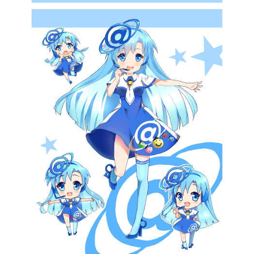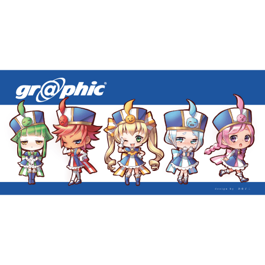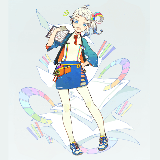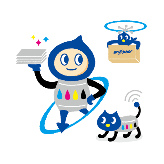 青を基調として、綺麗なフルカラー印刷もイメージしたカラフルなデザインにしました。グラフィックさんのプレミア感をあらわす金バッジを各所に着けています。腰から下げている用紙カタログのように、白い髪は紙を、リボンはカラーチャートをイメージしました。とても丁寧で誠実な子ですが、時々混じる京都弁がチャームポイントです。