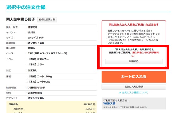 冊子の仕様を選択後、選択中の注文仕様画面にて、同人誌かんたん入稿を「利用する」ボタンをクリックして、ご注文手続きへお進みください。