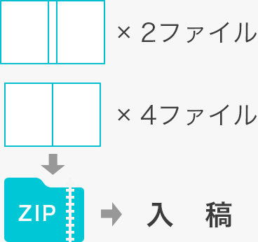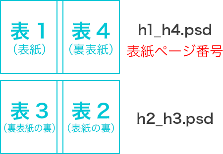 冊子のデータは見開き(2ページ分)を1ファイルとして必要なページ数分作成します。無線綴じ冊子では表紙2ファイルと、本文を必要なページ数分作成します。データのご入稿時に必要な数のファイルをまとめてご入稿いただきます。