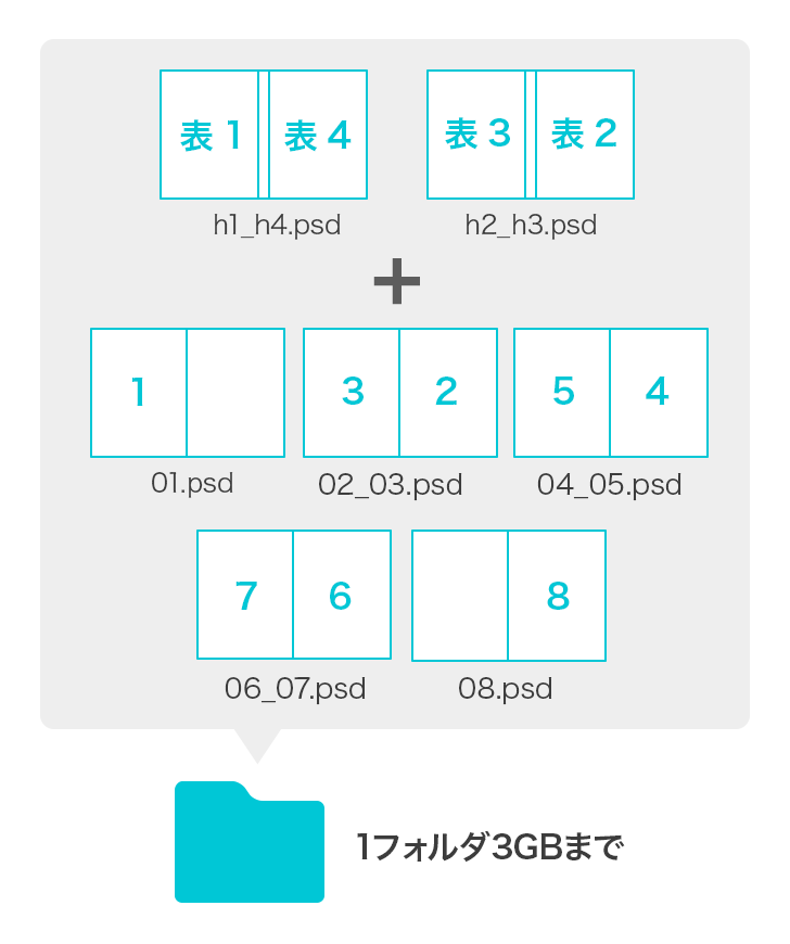 全てのデータをフォルダにまとめて入稿ページ数分のデータが完成したら一つのフォルダに入れて入稿します。各データはページ番号を含めたファイル名を付けます。フォルダのファイルサイズが3GBを超えてしまう場合は複数のフォルダに分けて入稿してください。