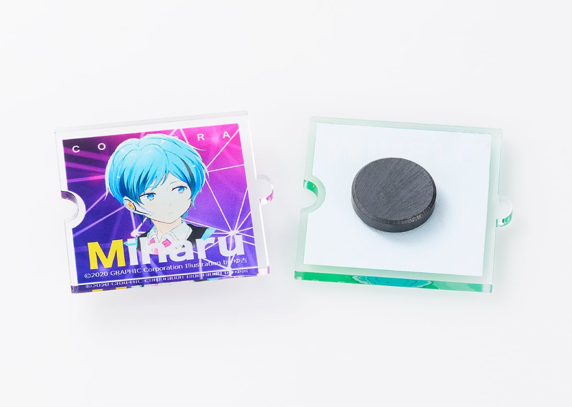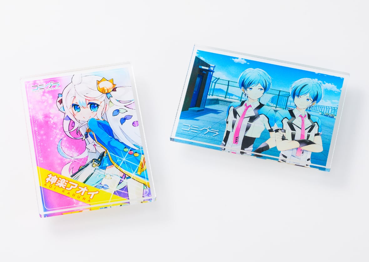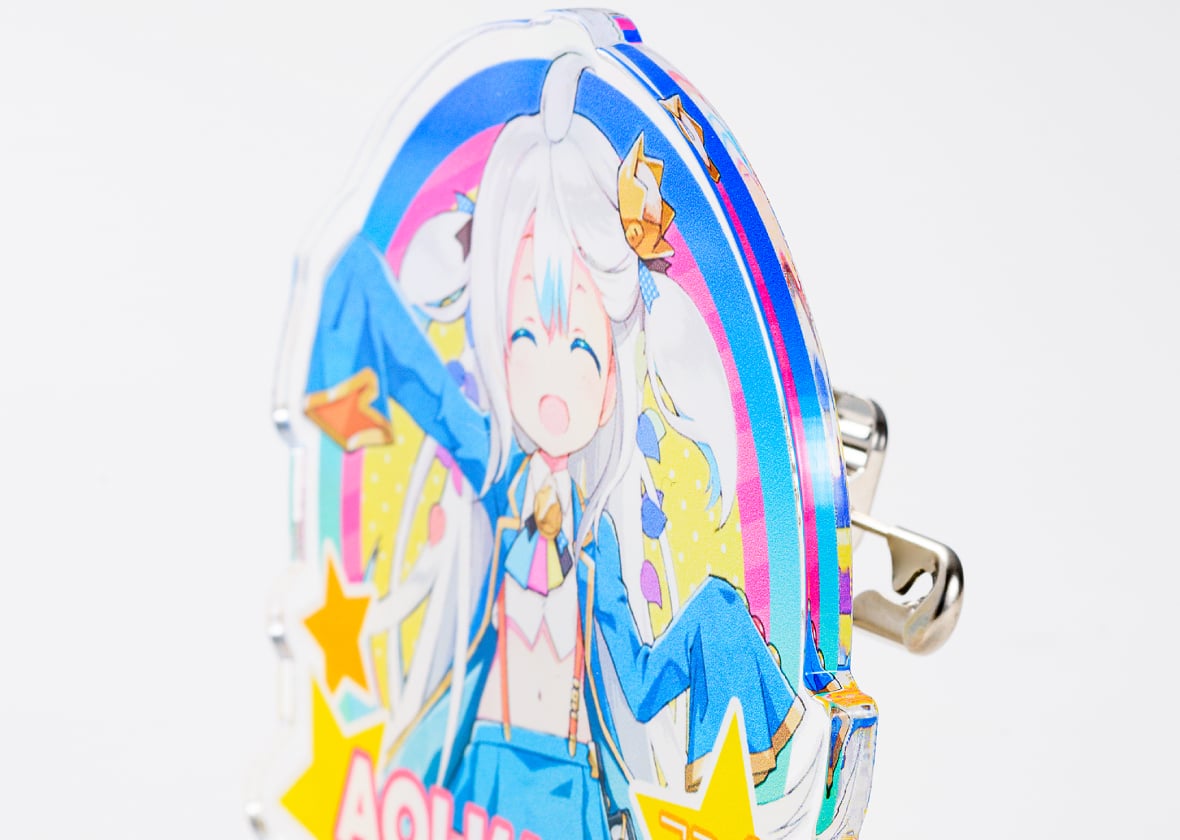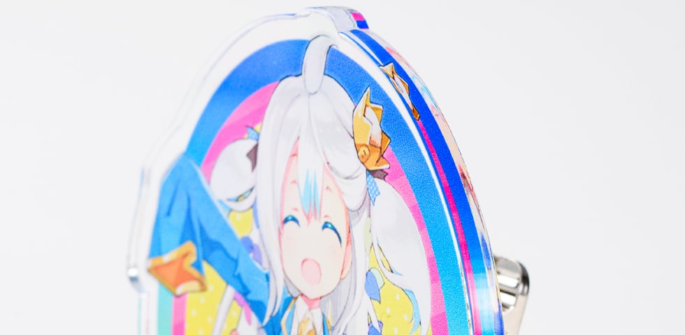透明アクリル素材(3mm厚)に高画質な7色(CMYKLcLmLk)印刷で、鮮明かつ濃厚な仕上がりです。イラストや写真に合わせて自由な形にカッティングでき、アクリルの切り口は「アイスメルトカット方式」により滑らかな断面です。裏面の印刷面にはニス加工でコーティングし、剥がれに強い処理を施します。