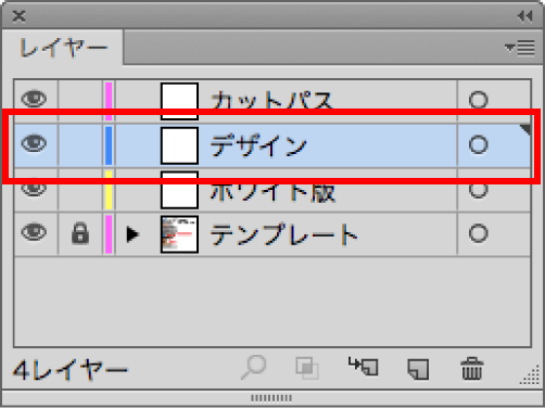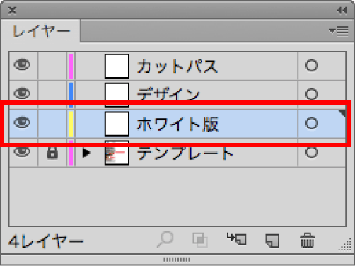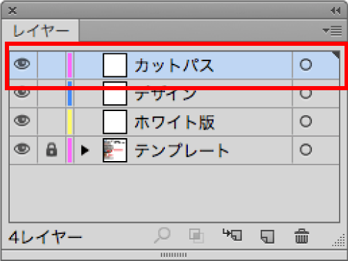「デザイン」「カットパス」「ホワイト版」は必ずレイヤーに分けて入稿データを作成してください。