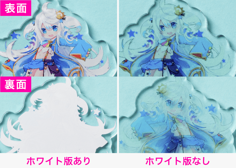 白インクなしで印刷した場合、透明感が増しクリアな仕上がりとなります。(右側の写真)