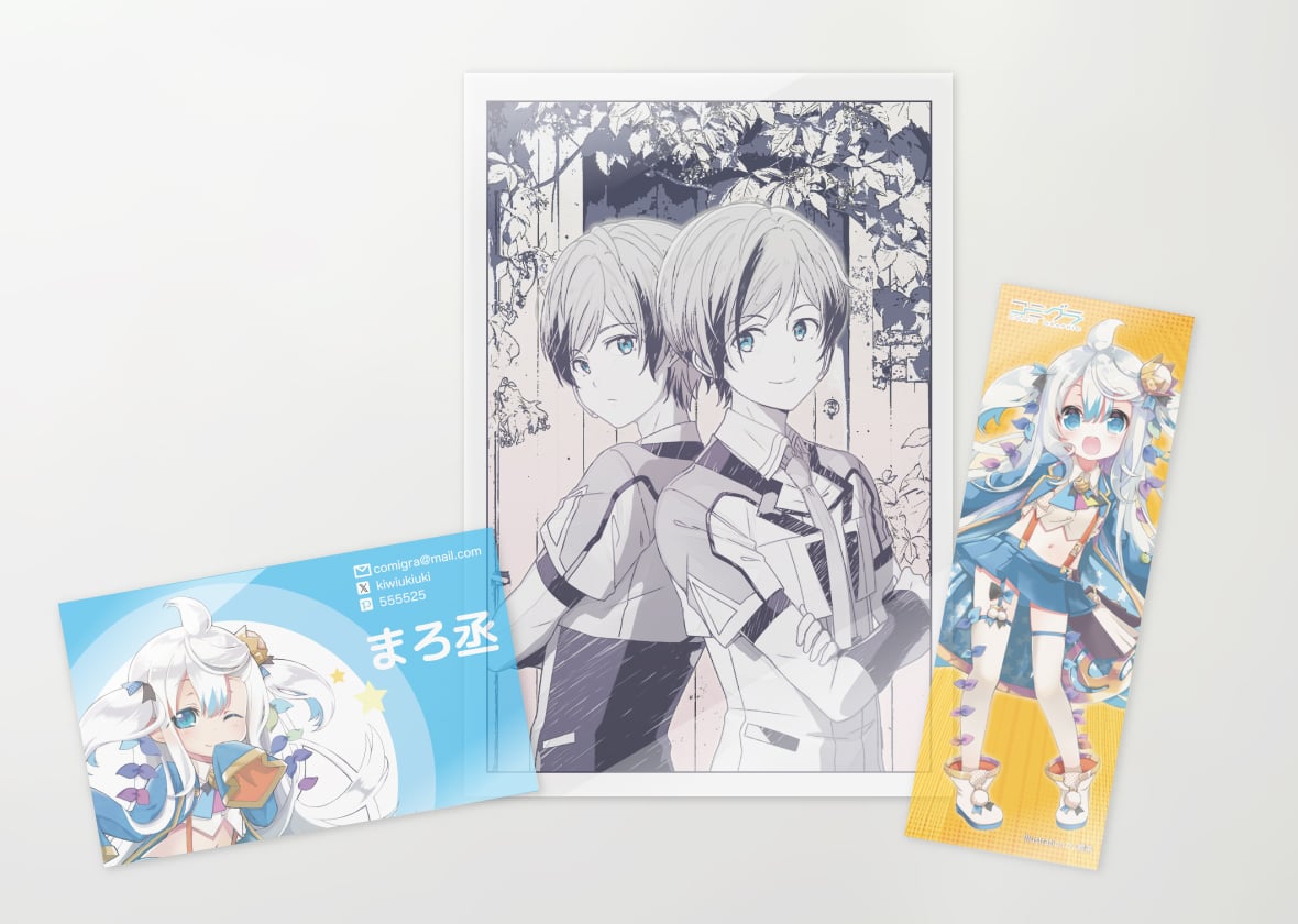 | サイズ | 名刺サイズ:55×91mm ポストカードサイズ:100×148mm しおりサイズ:40×115mm |