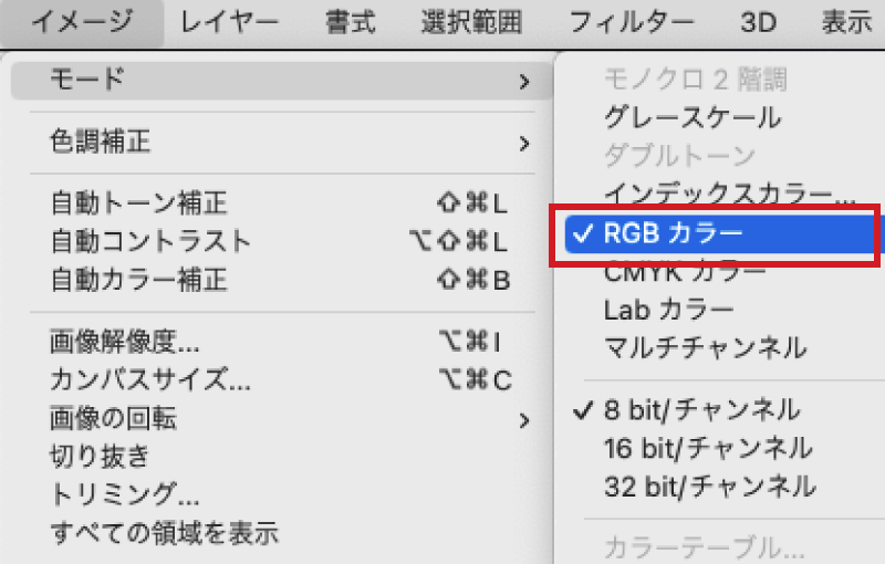 Photoshopで作成する場合、「イメージ」メニュー→「モード」→「RGBカラー」を選択し、入稿データをご作成ください。