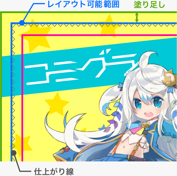 背景がある場合、塗り足しが必要となります。緑の線まで背景を作成してください。