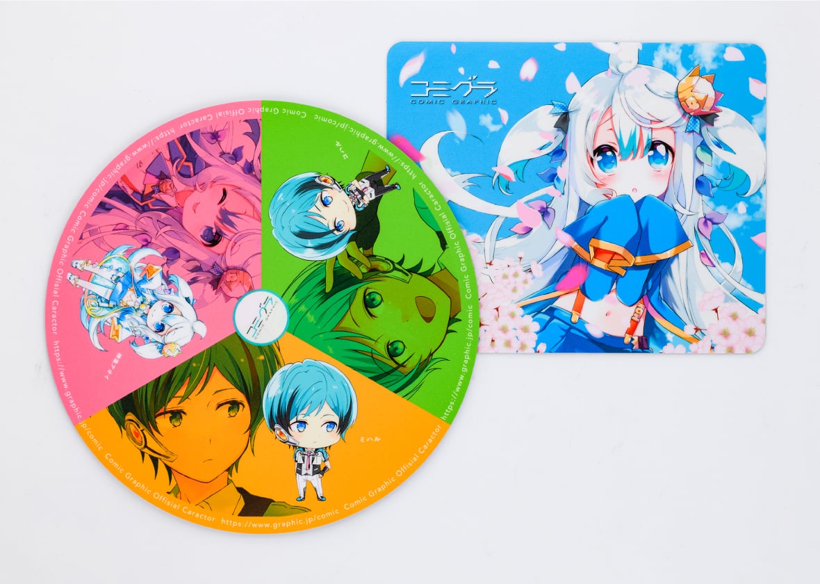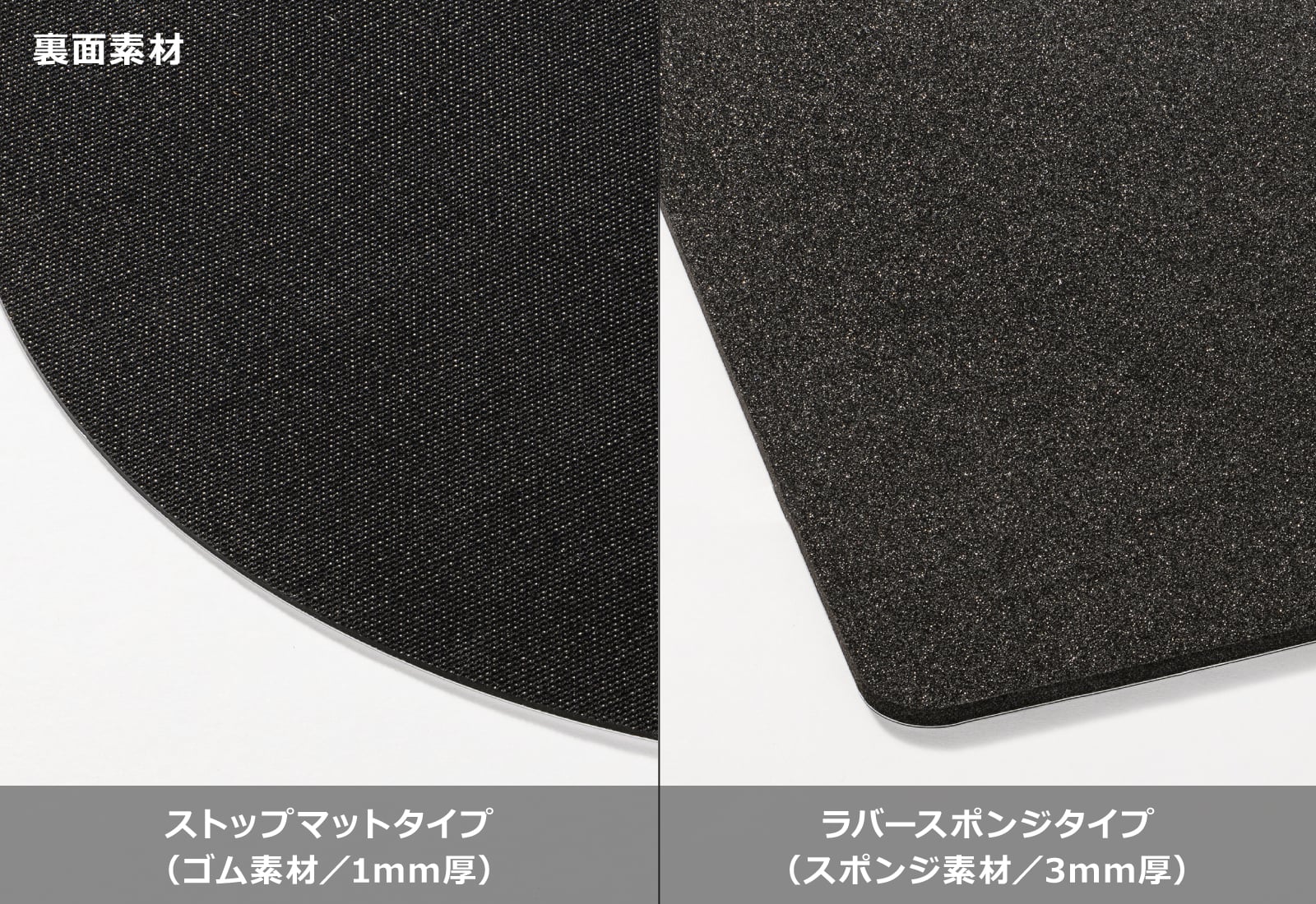 イベントの記念品やノベルティ、プレゼント用や自分だけのオリジナルマウスパッドとしてご利用いただけます。裏面素材には、薄く丸めて持ち運びも可能なストップマットタイプと、厚みとクッション性のあるラバースポンジタイプの2タイプをご用意。