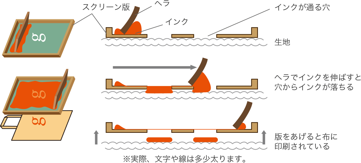 シルクプリントはスクリーン板を作成し、ヘラでインクを生地に押し出してプリントする方式です。