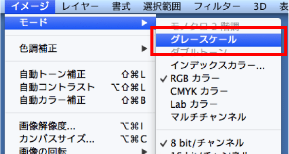上部メニューの「イメージ」→「モード」→「グレースケール」を選択してください。