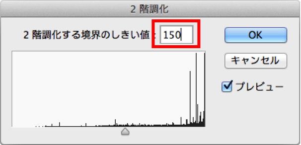 上部メニューの「イメージ」→「色調補正」→「2諧調化」→「境界のしきい値」に適度な数値を入力します。推奨は150ですが、2諧調化した後の画像(仕上がりイメージ)を確認してください。