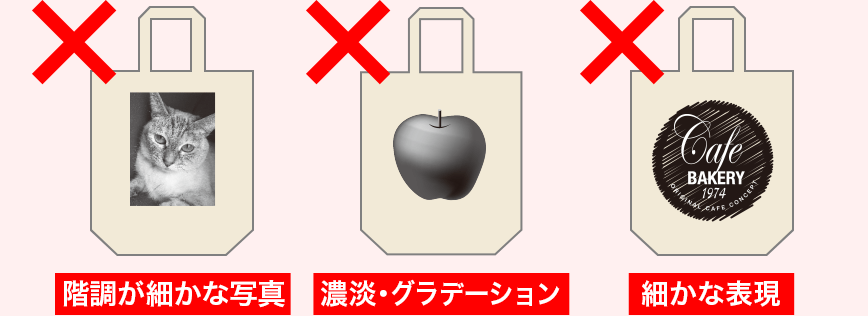 濃淡表現やグラデーション、ぼかし等の効果、細かい表現や写真などの画像データは不向きです。