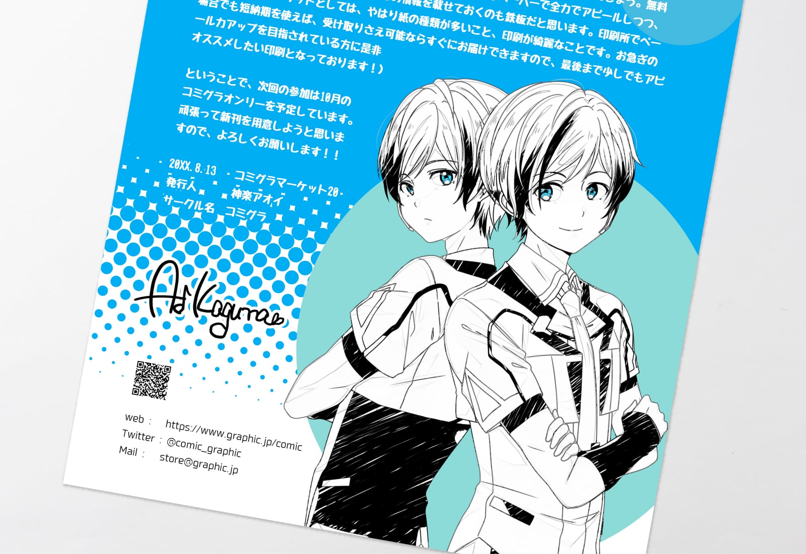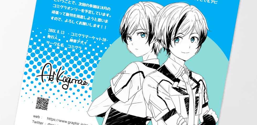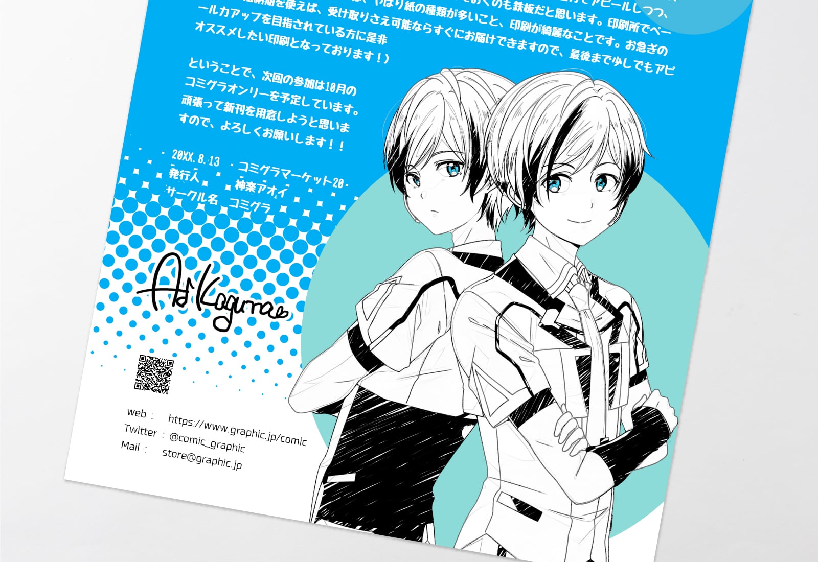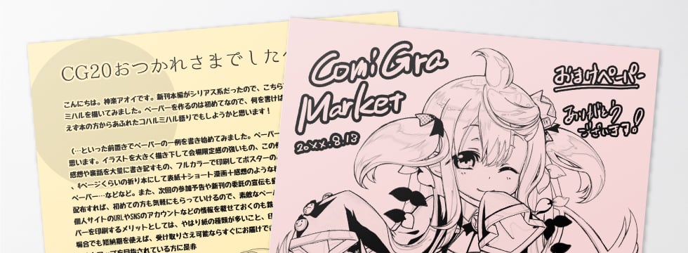 会場限定のおまけなどで定番のフライヤー・ペーパー印刷。描き下ろしのイラストや漫画、制作裏話や近況報告など、用途はいろいろ!