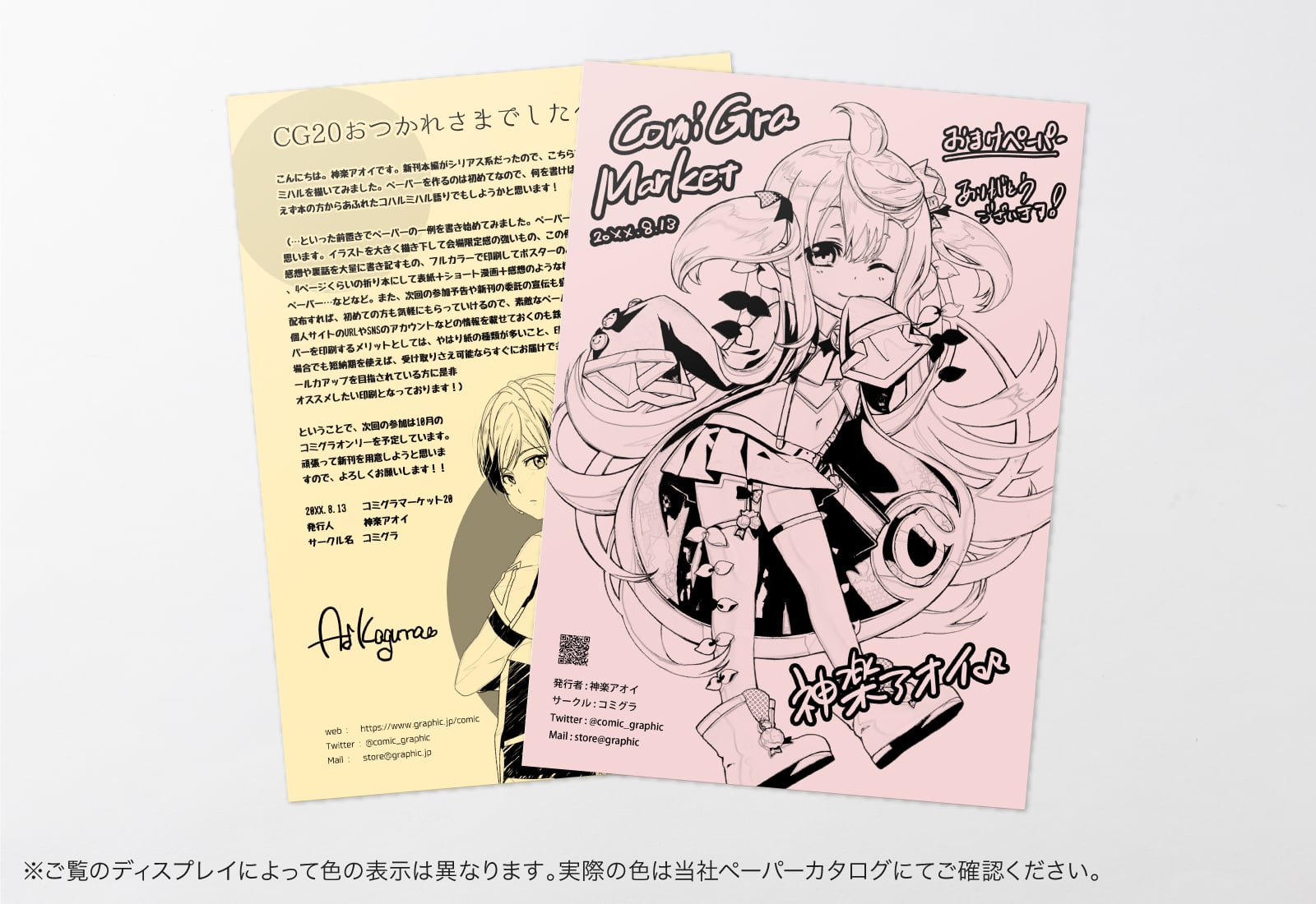 コミグラでは、人気のフルカラー印刷はもちろん、モノクロ印刷、特色印刷にも対応。10枚からご注文できます。色上質をはじめ150種以上の豊富な用紙や、各種オプションも取り揃えておりますので、お好きな仕様でペーパーを作成いただけます︕