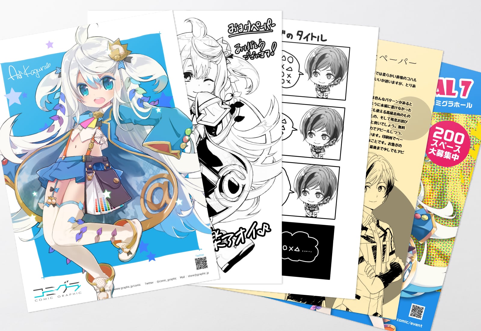 おまけや宣伝として即売会で定番の同人ペーパー。150種以上の用紙や各種オプションで印刷できます︕