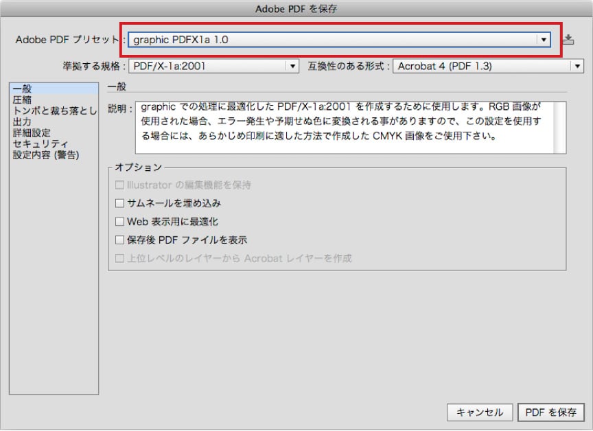 MacOS10.3、10.4では「“入稿データ”のアーカイブを作成」を選択します。