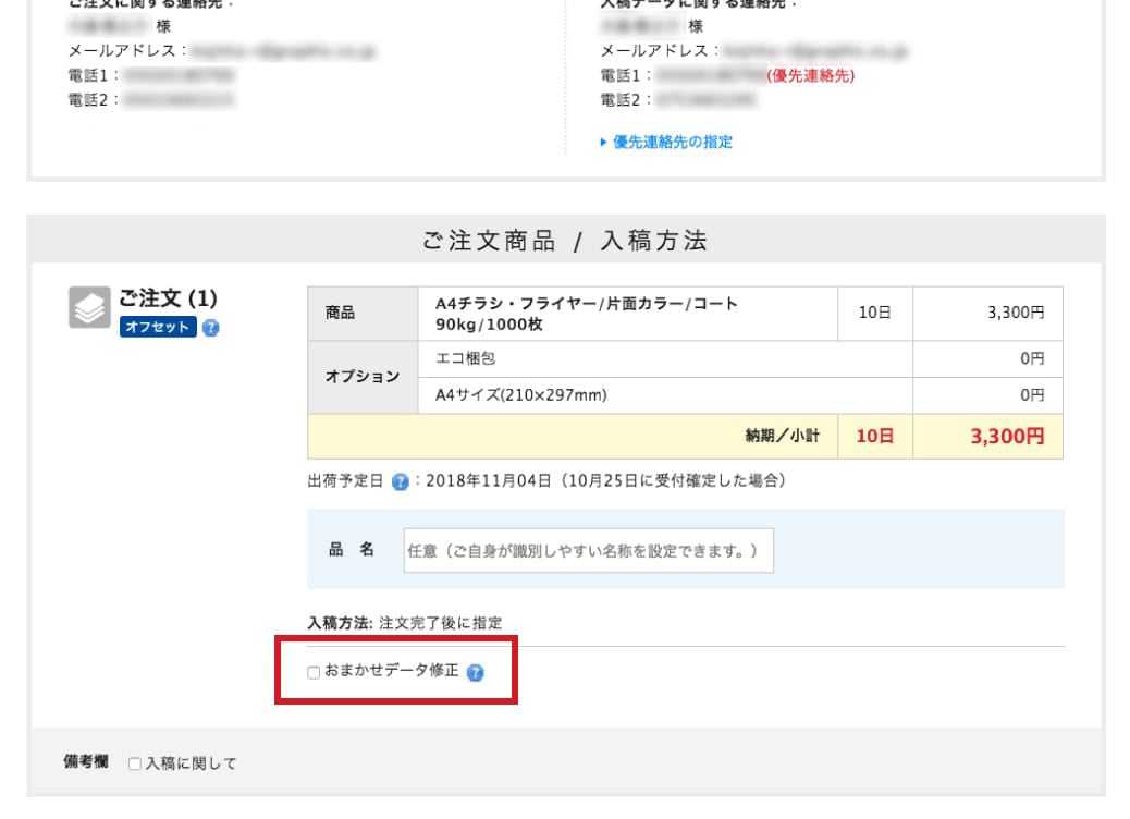 ご注文手続きの中にある「入稿方法」のオプションで、チェックを入れるだけ。