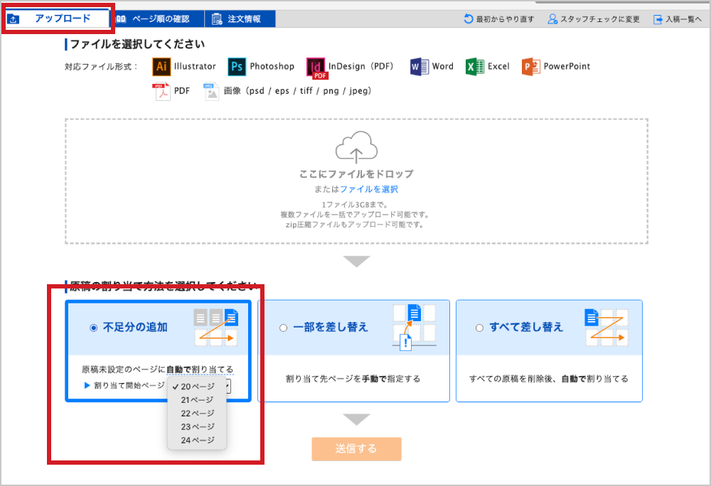 アップロードの原稿の割り当て方法で「不足分の追加」を選択し、割り当て開始ページのプルダウンから割り当てるページを選択してください。