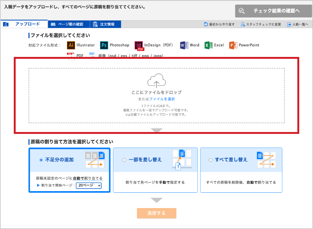 新しい原稿をドロップ(または選択)したあと、原稿の割り当て方法で「不足分の追加」を選択し、送信を開始してください。