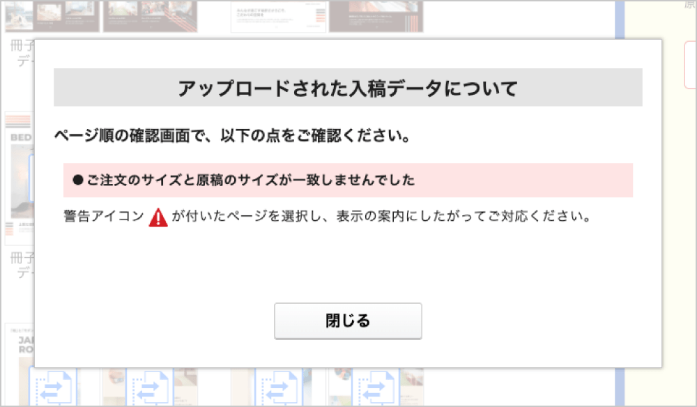 注文と原稿のサイズが一致しない場合、データチェックが完了するとアラートが表示されます。