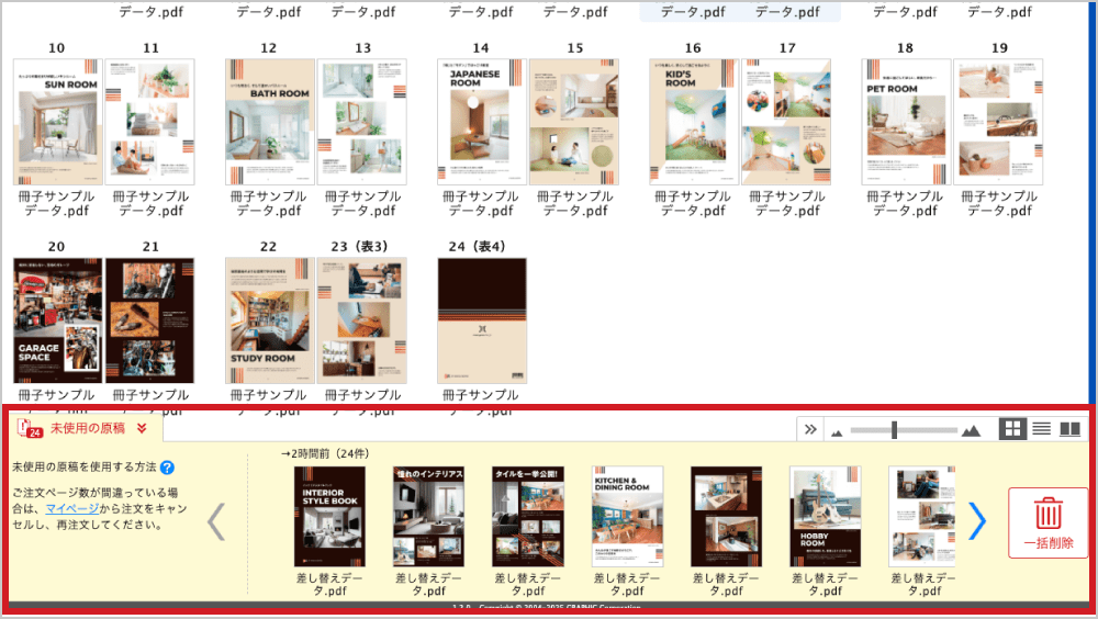 追加でアップロードした原稿は、ページ順の確認画面の下にある「未使用の原稿」で確認できます。