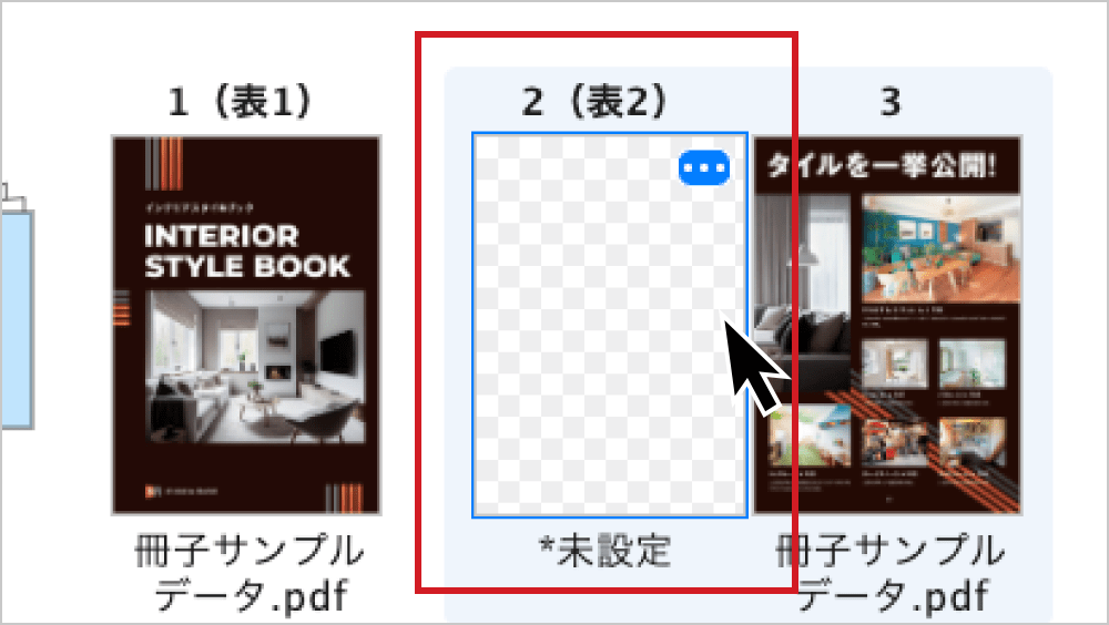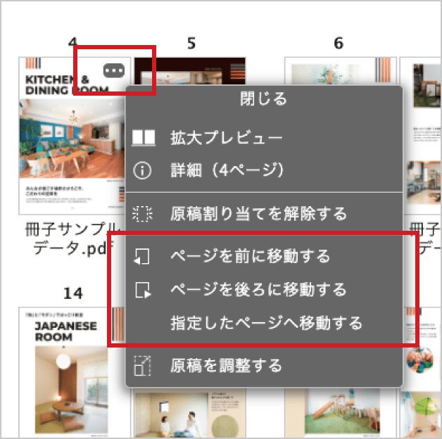 原稿のページ順を入れ替える場合は、ページにマウスを重ねるとドラッグして上下左右に自由に移動させることができます。また、ページ右上のメニューアイコンをクリックし、操作メニューから移動させることもできます。再度アップロードする必要はありません。