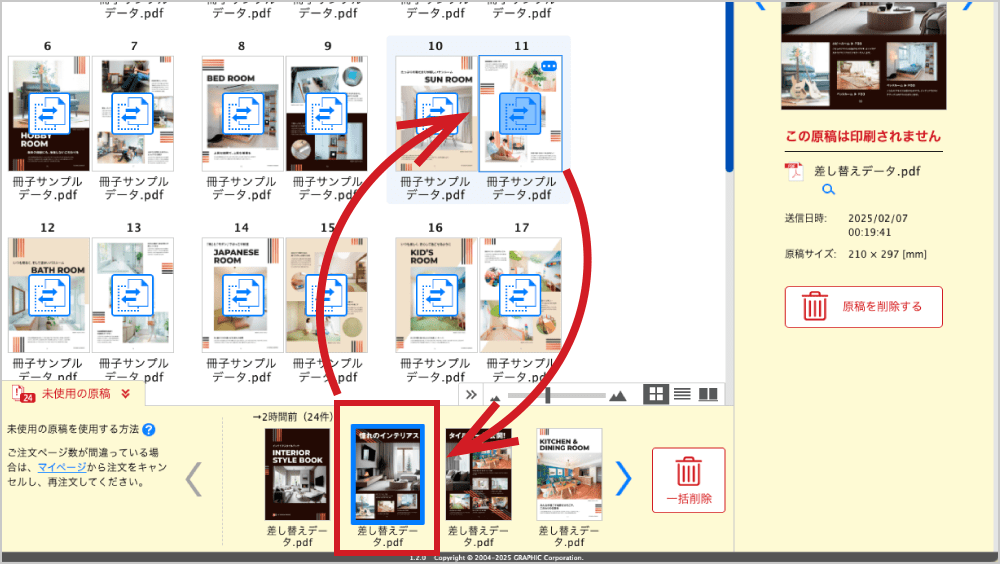 差し替えたいページを指定して未使用の原稿に差し替えることができます。