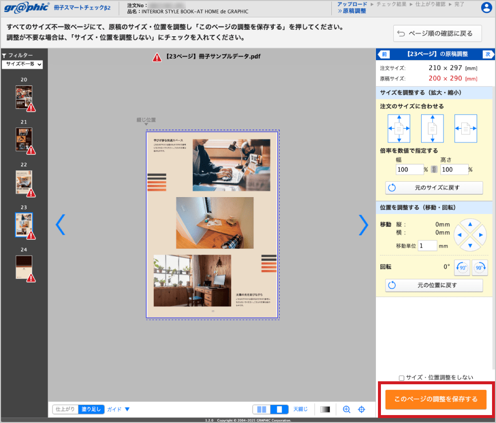 すべてのサイズ不一致ページの調整が完了したら、ページ順の確認画面に戻ってください。