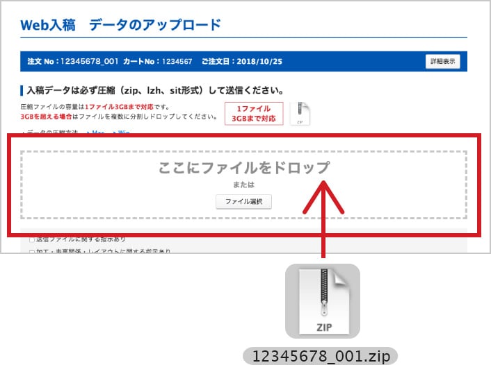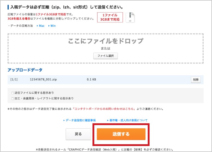 入稿データの圧縮が完了したらデータをアップロードします。