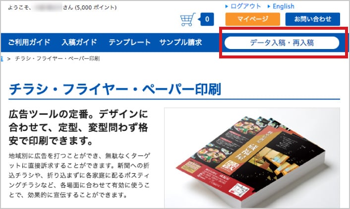1メニューから「データ入稿・再入稿」を選びます。