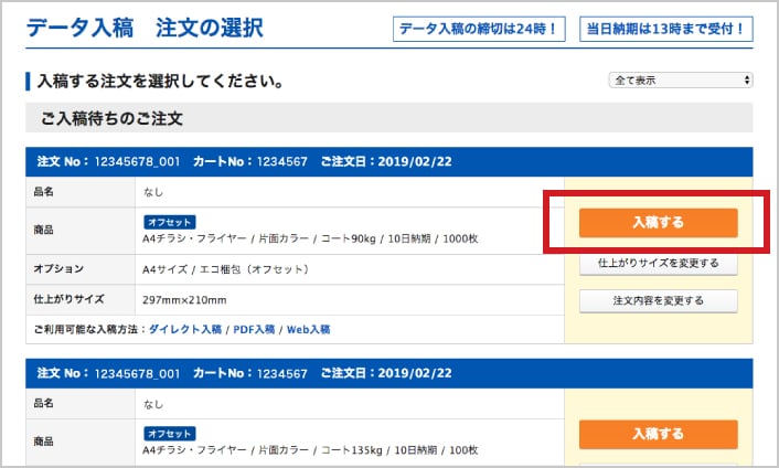 2入稿する注文を選択します。