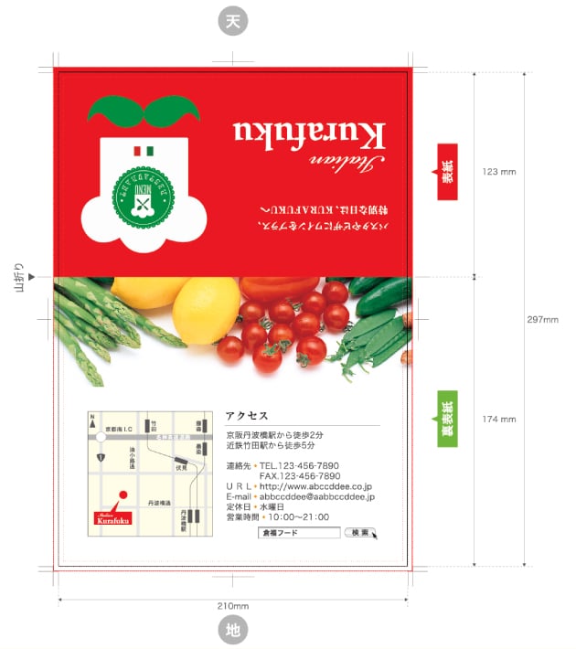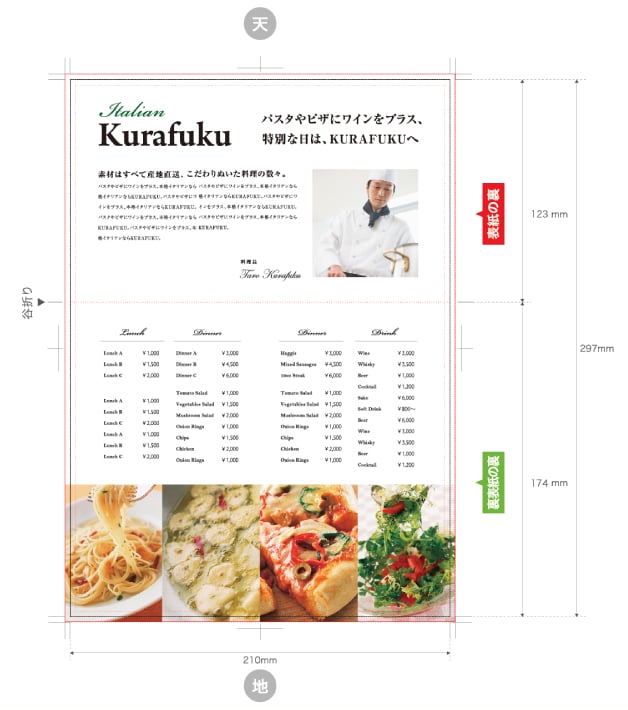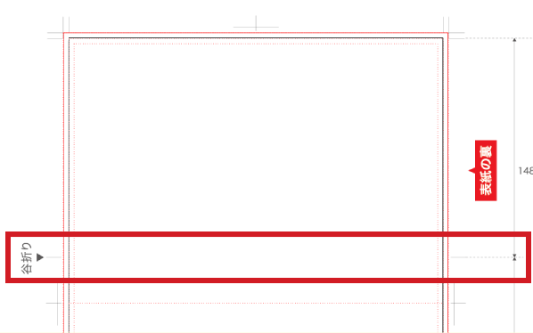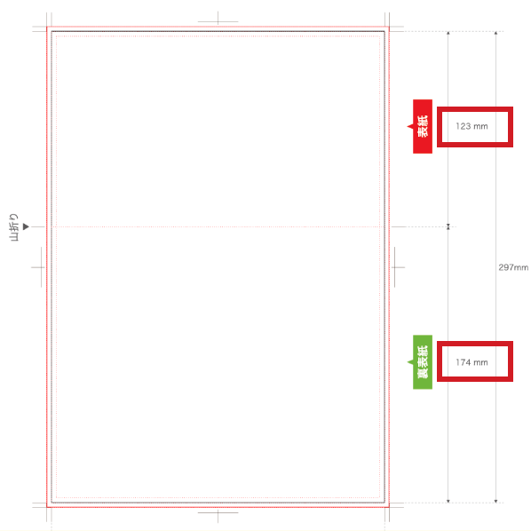 長辺「二つ折」でセンター位置以外での折り指示 内側のイメージ長辺「二つ折」でセンター位置以外での折り指示 表側のイメージ長辺「二つ折」でセンター位置以外での折り指示 裏側のイメージ