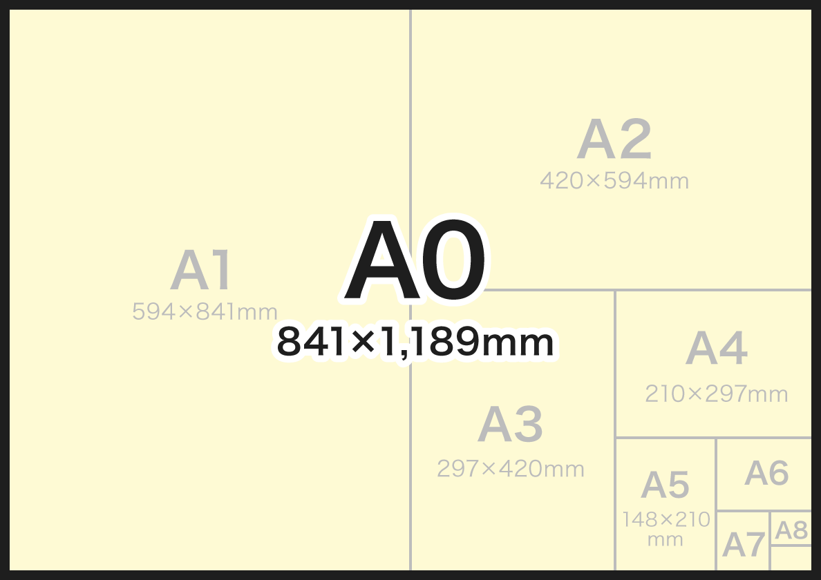 A0サイズ(A倍)とは「841mm×1,189mm」のサイズを指します。国際規格で定められた「A判」規格であり、A判の中では最大のサイズで、A1の2倍に相当します。A0サイズは大きめのポスターや学会ポスターとして利用されます。本記事ではA0サイズの主な用途やメリット、印刷時の注意点について解説します。