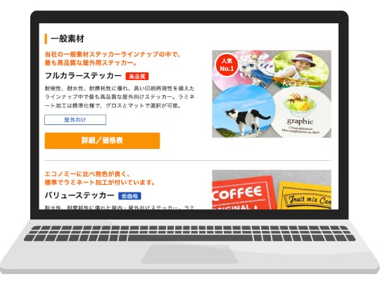 まずはネット印刷のWebサイトから作りたいステッカーの種類を選びます。ネット印刷では素材や加工も様々なものがあります。商品によってデータの作り方が異なるため、まずはステッカーの仕様を決めておきましょう。