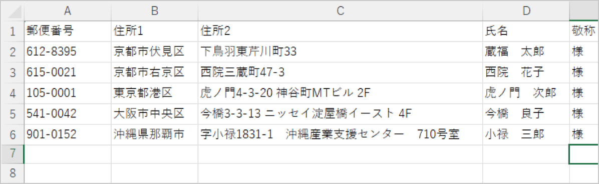 宛名シールの元となるデータを作成します。Excelファイルの1行目に下記の項目名を入れて、2行目以降に宛名情報を入力してください。