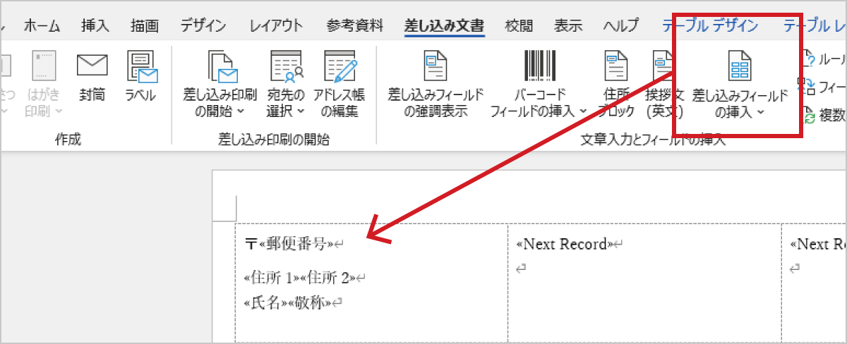 データを取り込んだら「差し込み文書 > 差し込みフィールドの挿入」で必要なフィールドを挿入しましょう。