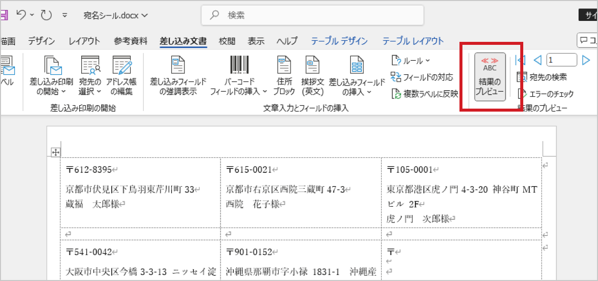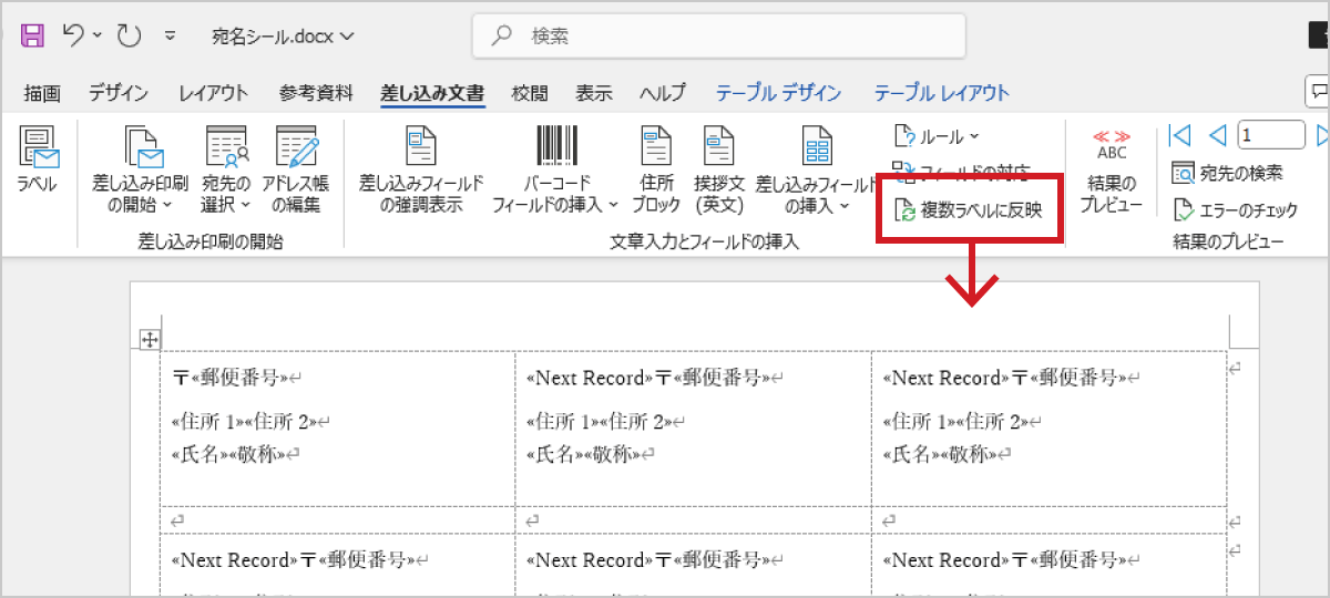 その後「差し込み文書」タブの「複数ラベルに反映」ボタンを押してほかのラベルにも反映させ、「結果のプレビュー」ボタンで挿入内容に問題がなければ、最後に「完了と差し込み」ボタンをクリックし、「文書の印刷」を選びます。
