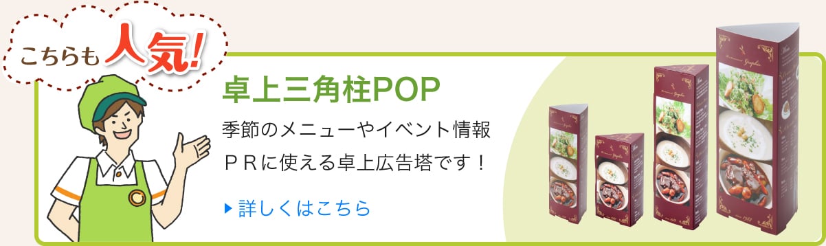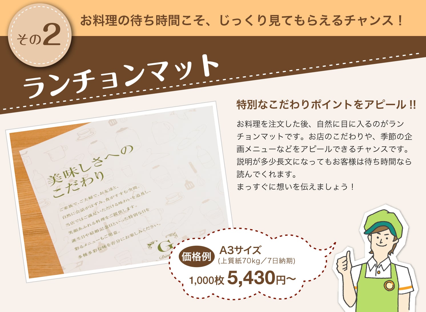 お店の全てのメニューを、使い捨てのランチョンマットに印刷。テーブルを汚れから保護するだけでなく、ブック型のメニューをセットする必用がないのでテーブルがスッキリ。しかも割安な紙のメニューでお店の経費節減にも効果的です!