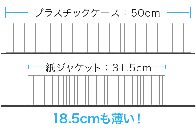 例えば50枚重ねた場合、プラスチックケースの幅は50cm。紙ジャケットなら31.5cmと省スペース。