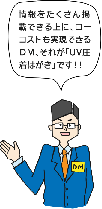 宛名印字(インクジェット)は、UV圧着はがきのほか、ポストカード印刷や封筒印刷各種など、さまざまなDM商品に対応しています!