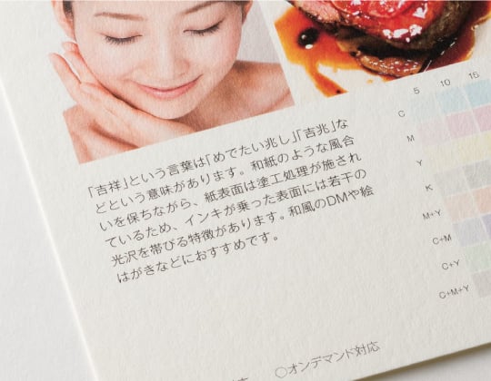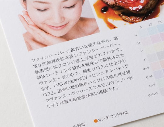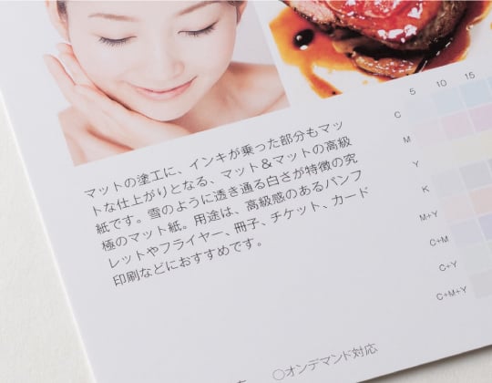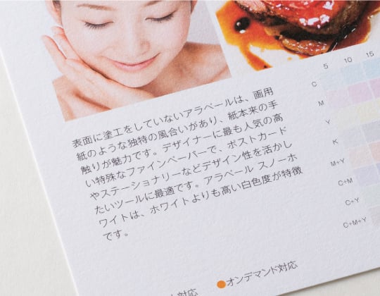 アラベール同様、紙本来の手触りを有しながらも、印刷部分は光沢があり、発色が良いのが特徴的な用紙です。元々個性を出したいデザイナーに人気の用紙のため、正方形名刺とも相性抜群です。