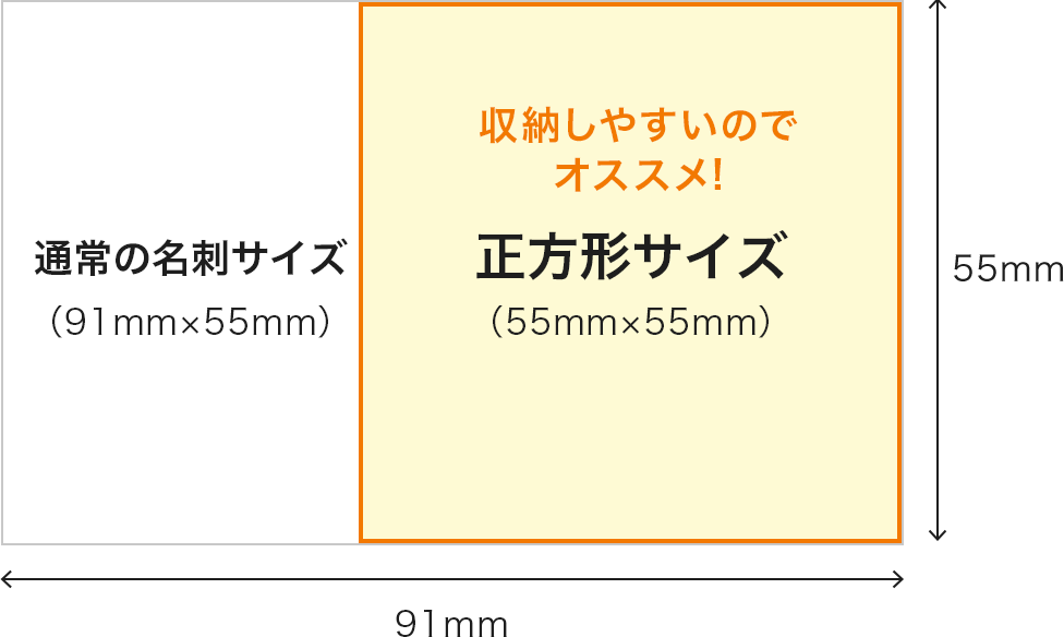 名刺ホルダーは一般的な名刺(91mm×55mm)が収まるように作成されていることが多いので、55mm×55mm以上の大きさで正方形の名刺を作成してしまうと名刺ホルダーに収めることができず、相手の管理が難しくなってしまいます。正方形の名刺を作成する際は、サイズに気を付けて作成するようにしましょう。