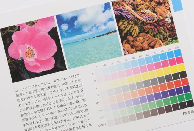 印刷における特性としては、インクが染み込みやすく、乾きが早いのが特徴です。文字などの印刷とは相性が良く、用紙の白さと光の反射の少なさも相まって、文章の可読性を高めることができます。一方でカラー印刷では、色が落ち着いた発色となるため鮮やかな色表現は不得意です。