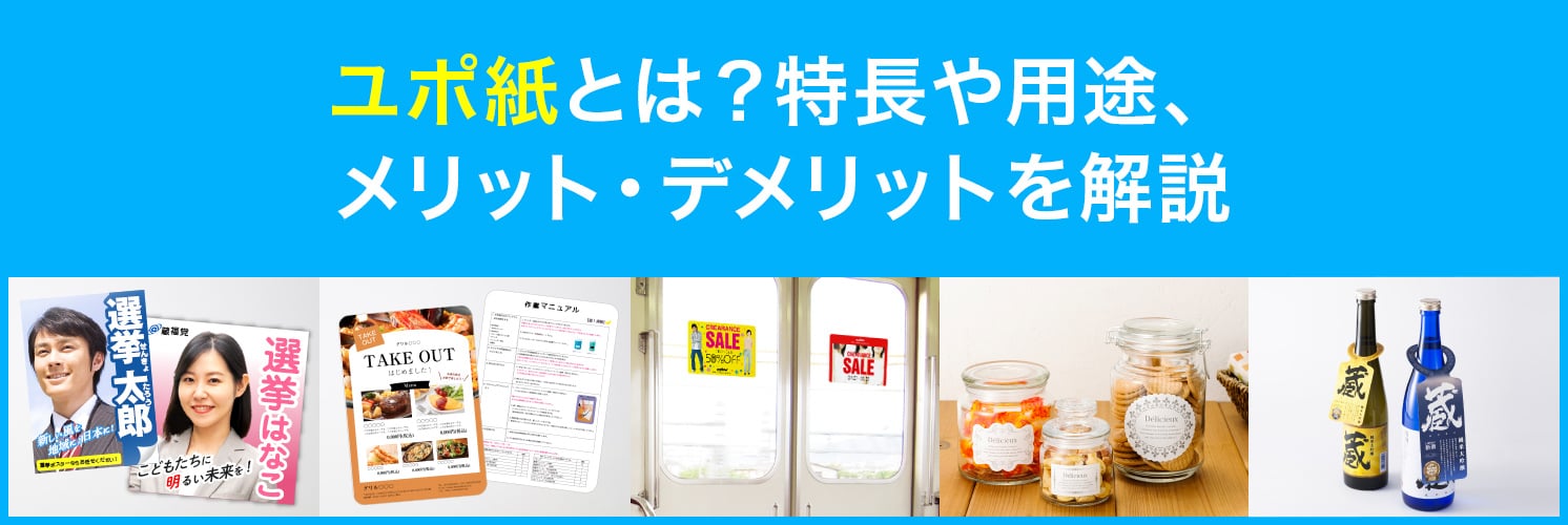 また、屋外に貼り出される選挙用ポスターにも、雨や破れに強いユポ紙が採用されています。選挙用ポスターでは貼り付けに便利な、裏面がシールになったユポ紙が用いられることが多く、選挙期間中に雨ざらしでも、しわが寄りにくく、剥がれにくい性質を持っています。