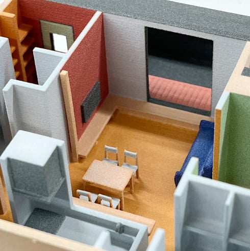 ナイロン粉末を焼結して造形する方式(Multi Jet Fusion方式)で、フルカラー造形が可能なのでリアルな建築模型が製作できます。サポート材(支持体)がつかないため、入り組んだ構造の確認に最適です。複数のパーツが配置可能で、建具や家具の配置シミュレーションにもご利用いただけます。