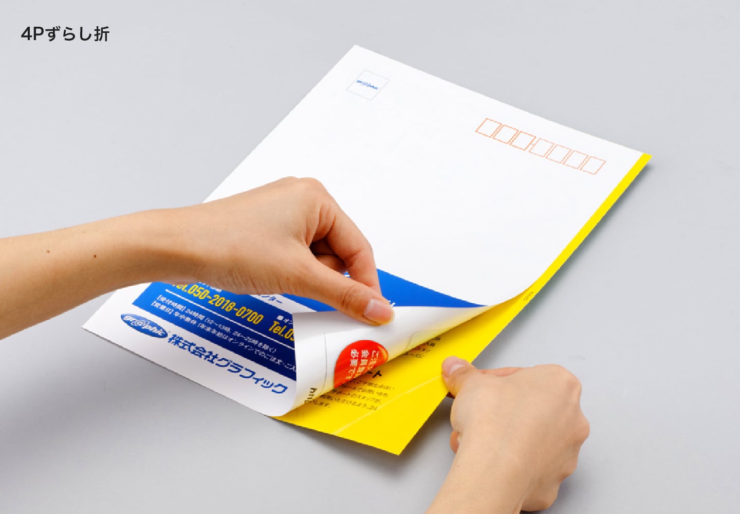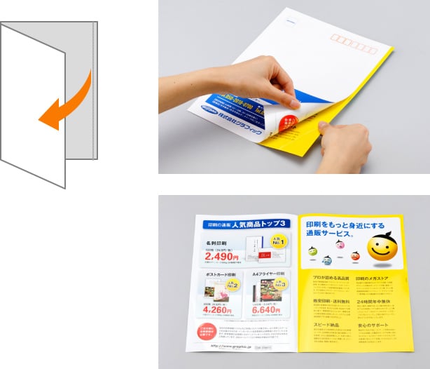 デザインやレイアウトにも工夫ができ、圧着印刷独特のめくる楽しみで、通常封筒DMと比べても開封率・反応率のアップが期待できます。