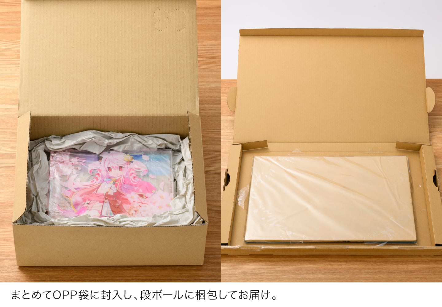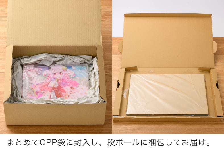 | 納品形態 | アクリルボード本体とスタンド脚をそれぞれOPP袋で個別包装し、段ボールに梱包してお届けします。 |