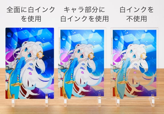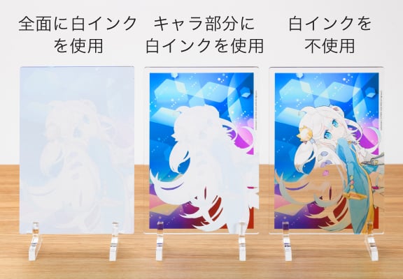アクリルに印刷するため、色のインクだけでは透けた状態での仕上がりとなります。