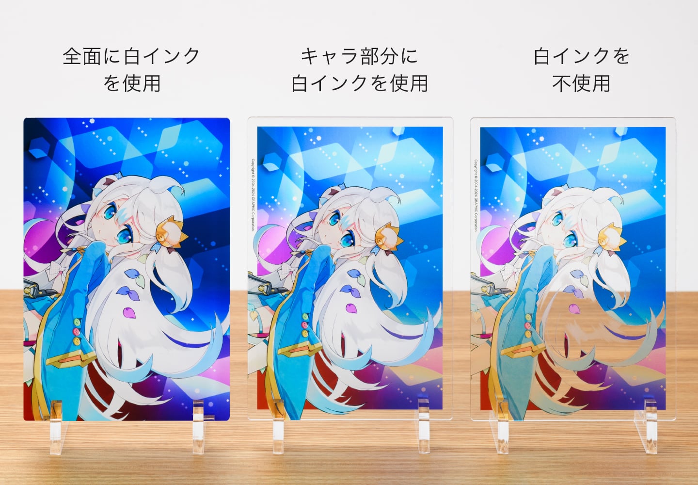 白インクなしで印刷した場合、透明感が増しクリアな仕上がりとなります。(右側の写真)