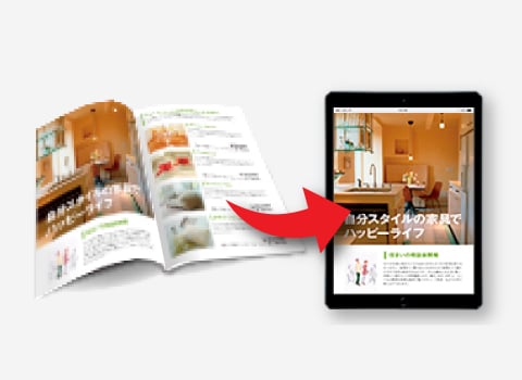 フリーペーパー・カタログ・広報誌・会社案内などの冊子データを電子ブック(e-book)にできるサービスです。