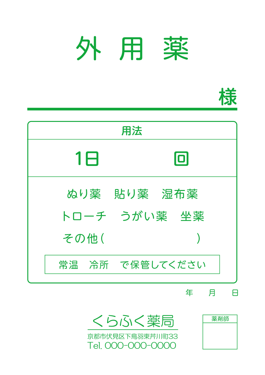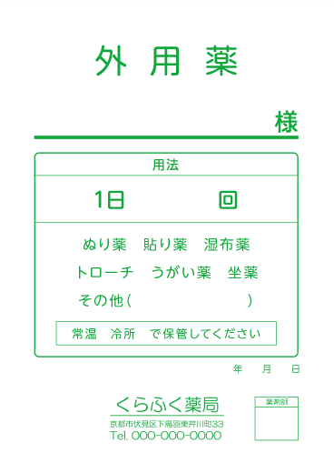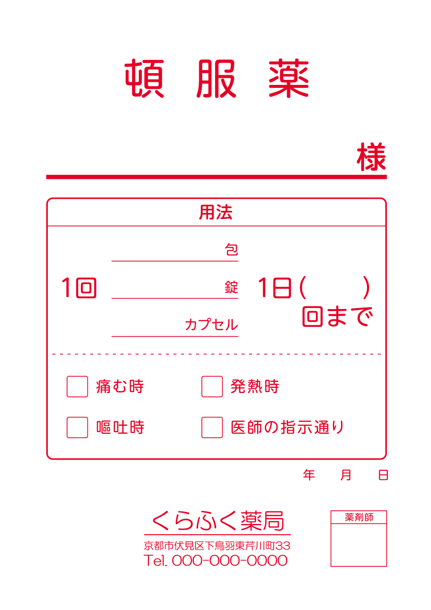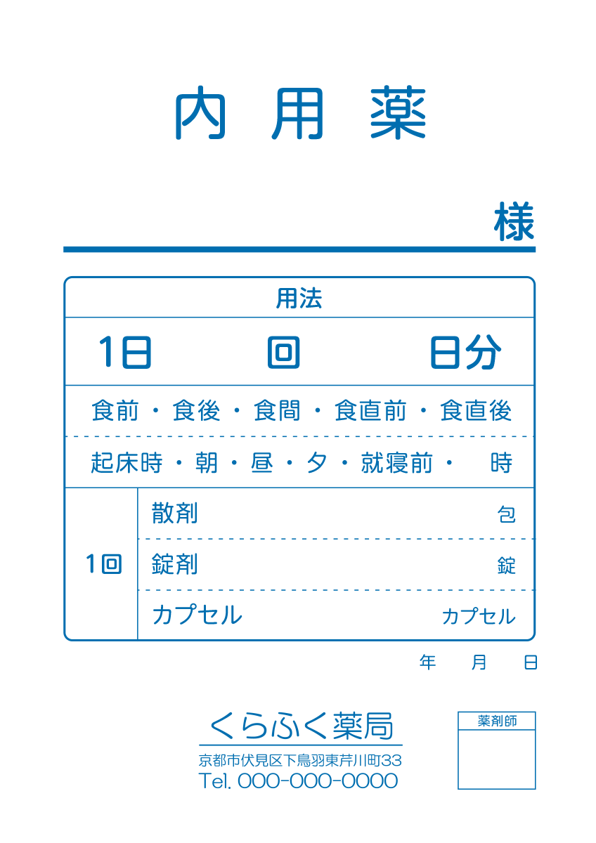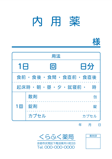 薬袋は「薬剤師法」「薬剤師法施行規則」により、以下の記載が定められています。(1)患者氏名 (2)用法、用量 (3)調剤年月日 (4)調剤した薬剤師の氏名 (5)調剤した診療施設の名称、および所在地当社では、記載内容やデザインに関しての確認は行わないため、お客様がご判断のうえ、必要に応じてデータ作成いただくようお願いいたします。